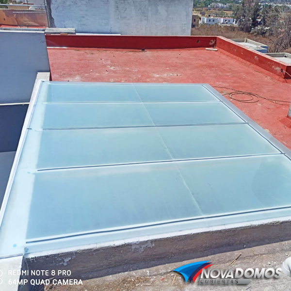 Ofrecemos el servicio de suministro e instalación de cubiertas de Vidrio templado este tipo de cubiertas es de lo más estético para su uso en áreas a la vista en donde se desee cubrir, además se puede mejorar la funcionalidad del vidrio con la aplicación de películas para el control solar, privacidad y seguridad. En Novadomos tenemos amplia experiencia con el vidrio templado diseñando y desarrollando proyectos desde cero. Es decir, desde la planeación en proyecto ejecutivo, planos, renders, desglose de materiales y desarrollo en la obra. El vidrio templado es el producto que se obtiene al someter un vidrio a un proceso térmico para conseguir que sus propiedades mecánicas mejoren. El vidrio obtenido de este proceso térmico tiene una resistencia cinco veces mayor que la del vidrio original. Lo que lo convierte en el producto ideal para su uso en domos y cubiertas. Es un vidrio seguro ya que de estrellarse este estalla en pedazos pequeños que resultan inofensivos al corte.